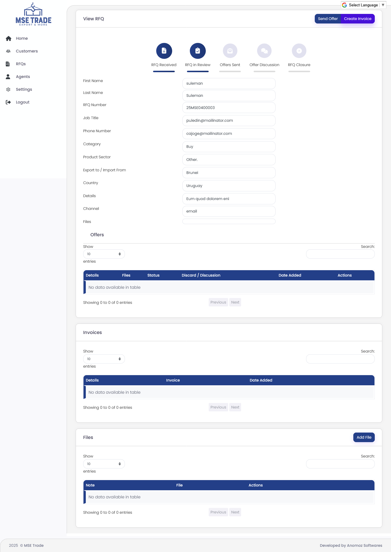 MSE Trade is a customer and RFQ management system designed to streamline trade requests, agent coordination, and invoice processing within a structured CRM platform. The system centralizes customer interactions, RFQ tracking, and administrative workflows to ensure transparent and efficient trade management.