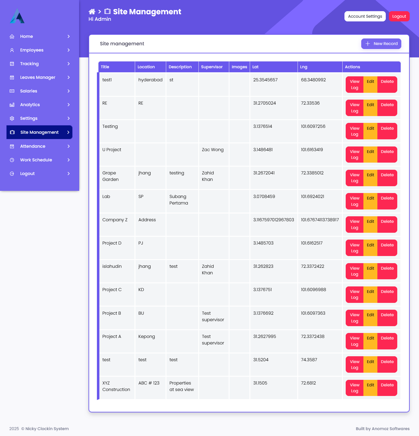 Nicky Clockin System is an employee attendance and workforce management platform designed to track employee hours, manage leave, and oversee site operations within a centralized system. The platform streamlines attendance, payroll, and scheduling, providing efficient oversight of workforce activities.