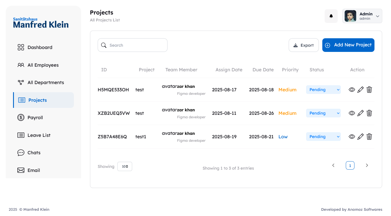 In summary, ManfredKlein combines HR management, project tracking, payroll, and internal communication into a single platform, delivering organized, secure, and efficient employee and project management operations.