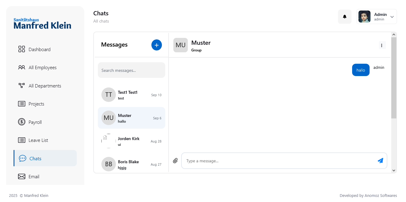 ManfredKlein is a comprehensive HR and project management platform designed to streamline employee tracking, departmental management, and internal communication. The system provides an intuitive interface for administrators, managers, and employees to manage projects, payroll, leave, and communications efficiently.